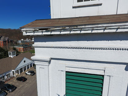 Rotting was noticed on Thomaston Congregational Church's steeple. In order to receive an accurate estimate on the cost to repair the steeple, Aeolus Aerial was hired to take photographs of the damage from the sky.